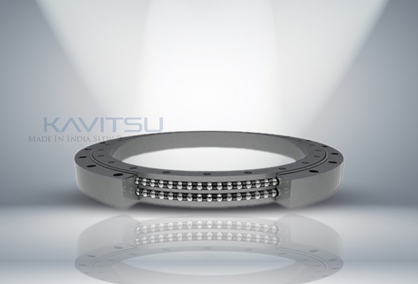 Double row ball Slewing bearing by Kavitsu is an example of highest quality standards. These eight point double row ball slew bearings are manufactured using precise machinery. The specially designed CNC groove grinding machine ensures perfect 8 point ball contact is maintained, which in turn makes sure that the slew bearing has higher life. Our range for single row ball starts at 400 mm and goes up to 3200 mm.
