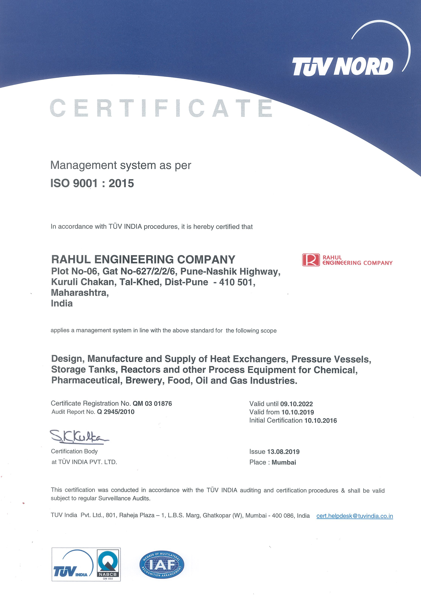 ISO 9001:2015 for Design & Manufacture of Process Equipment